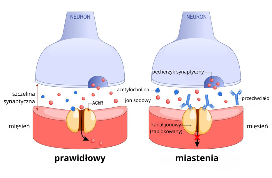 Przeciwciała te zmniejszają liczbę i sprawność receptorów oraz zaburzają funkcjonowanie złącza nerwowo-mięśniowego. W efekcie sygnał z nerwu nie jest przekazywany do mięśnia w sposób wystarczająco skuteczny, co prowadzi do typowego dla miastenii osłabienia nasilającego się podczas wysiłku.